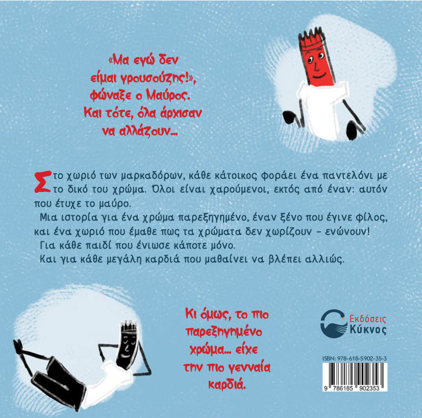 Στο χωριό των μαρκαδόρων, κάθε κάτοικος φοράει ένα παντελόνι με το δικό του χρώμα. Όλοι είναι χαρούμενοι, εκτός από έναν: αυτόν που έτυχε το μαύρο. Μια ιστορία για ένα χρώμα παρεξηγημένο, έναν ξένο που έγινε φίλος, και ένα χωριό που έμαθε πως τα χρώματα δεν χωρίζουν – ενώνουν! Για κάθε παιδί που ένιωσε κάποτε μόνο. Και για κάθε μεγάλη καρδιά που μαθαίνει να βλέπει αλλιώς.